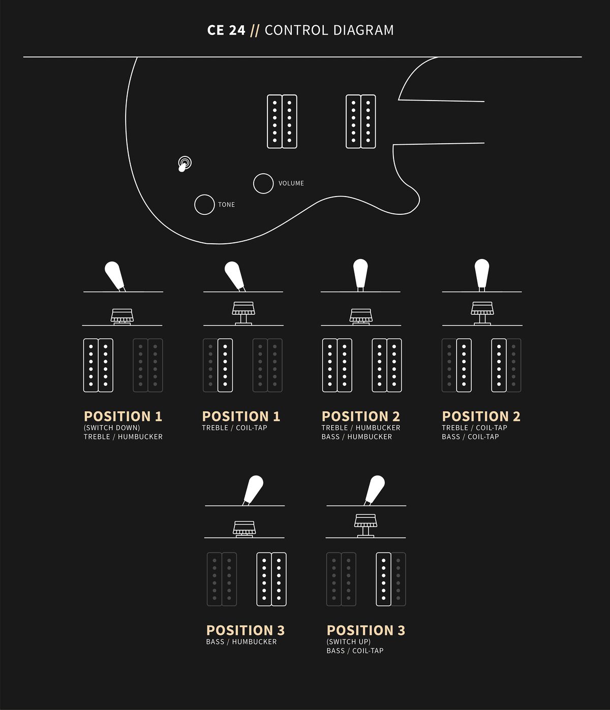 To further maximize the guitar’s inherent tone and clarity, the CE 24 features PRS 85/15 pickups, which were designed to have clarity across their extended high and low end frequencies. The electronics consist of a volume and push/pull tone control with 3-way toggle switch for a total of six classic sounds.