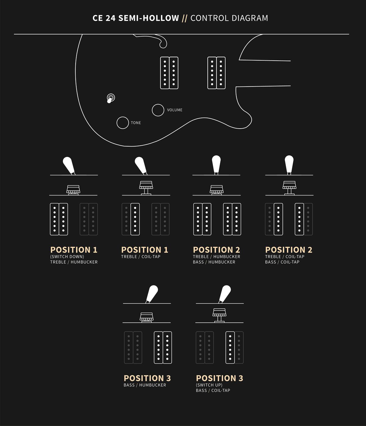 The CE 24 Semi-Hollow boasts PRS 85/15 pickups, which were designed to have clarity across their extended high- and low-end frequencies. The electronics consist of a volume and push/pull tone control with a 3-way toggle switch, giving a total of six classic sounds from the PRS 85/15 pickups.