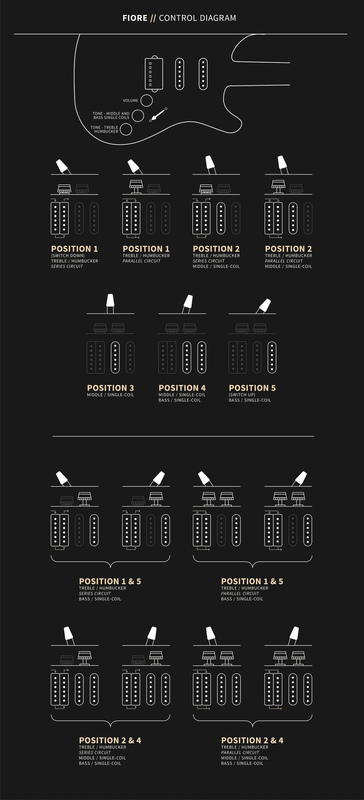 But the tone exploration doesn’t stop there. The Fiore model features a 5-way blade switch with traditional wiring (bridge / bridge + middle / middle / middle + neck / neck). The Fiore also features a single volume and two push/pull tone controls, which further adds to this guitar’s tone-shaping abilities.