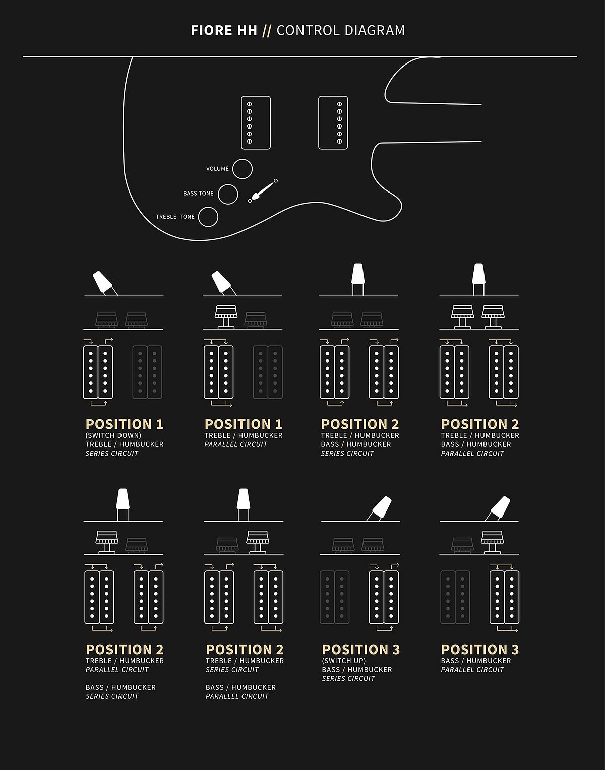 The Fiore-H humbuckers have enough power and punch for high-gain lead tones but with a smooth top end that allows the pickup to be played clean, even with the volume knob wide open. By pairing these pickups with a master volume, two push/pull tone knobs, and 3-way blade switch, the Fiore HH brings exciting voicing options to players. Each tone control acts as an individual series/parallel selector for each pickup. When in series, you get the full humbucker sound - warm full lows and mids and an articulate top end. When in parallel, the pickups take on more of a single coil sparkle with a slightly scooped feel and more brilliance. In all, players can explore eight tonal combinations