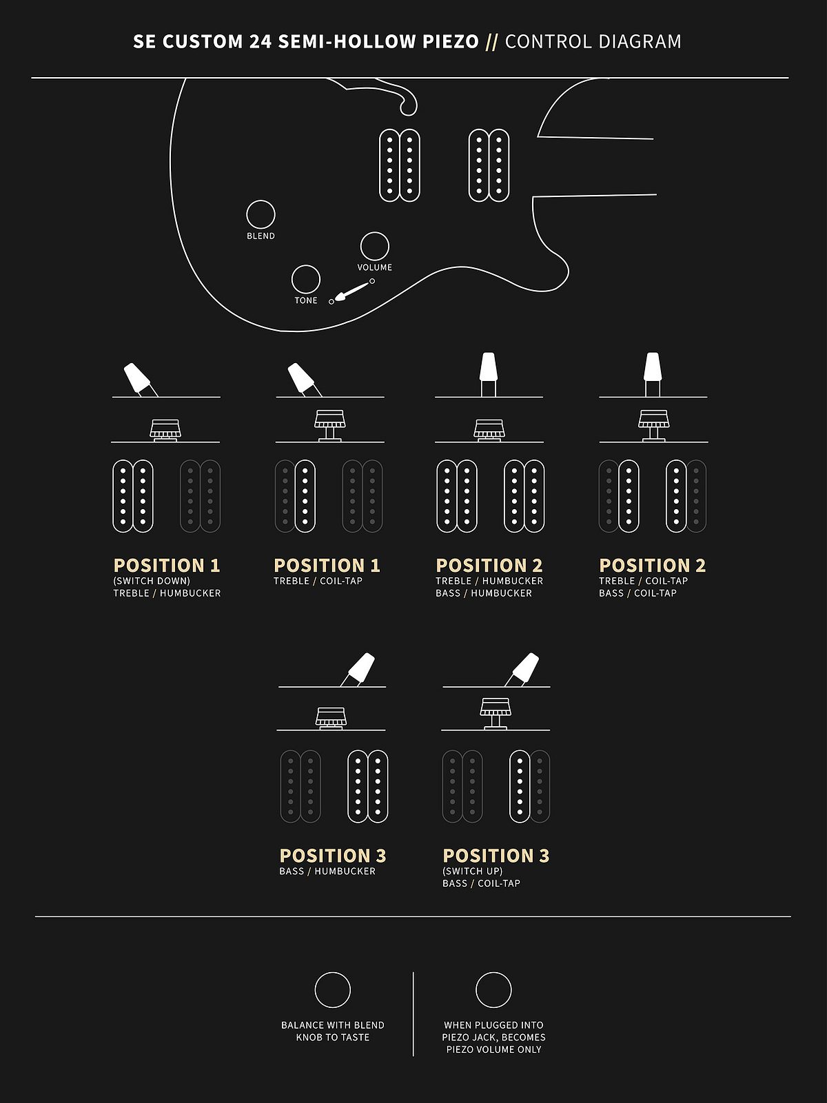 The humbuckers in this model are PRS 85/15 “S” pickups, which can be tapped via the push/pull tone control for more sounds. The addition of the LR Baggs/PRS Piezo system furthers the instrument’s versatility by offering electric and acoustic tones in one guitar. The PRS SE Custom 24 Semi-Hollow Piezo is designed with two discrete volume controls (magnetics and piezo) and output jacks (mix/piezo and magnetics). Players can plug into the “Mix/Piezo” jack and use the individual volume controls to blend the 85/15 “S” pickups with the piezo’s acoustic tones. Alternatively, players can plug into the jacks separately, so the guitar can run magnetic pickups into an amp and run the piezo through an acoustic amp or DI into the soundboard. When using the magnetic output jack in isolation, the piezo battery is bypassed completely, acting as a failsafe (in this scenario, the magnetic pickups still work even if the piezo battery has run out of juice).