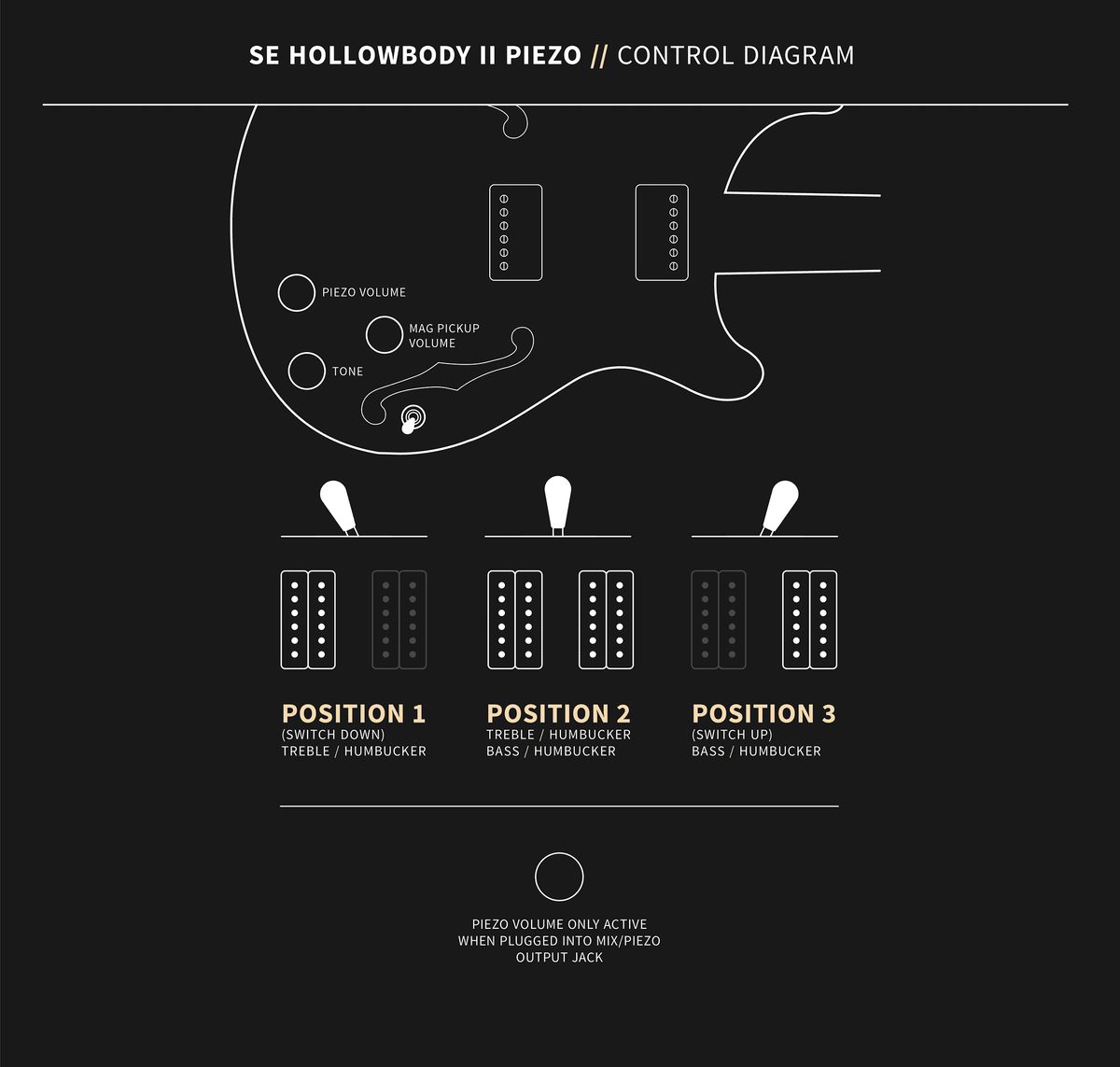 Boasting an LR Baggs/PRS Piezo system, the SE Hollowbody II Piezo provides musicians with the versatility of wielding both acoustic and electric tones in one instrument. The instrument is designed with two discrete volume controls (magnetics and piezo) and output jacks (mix/piezo and magnetics). Players can plug into the “Mix/Piezo” jack and use the individual volume controls to blend the 58/15 LT “S” pickups with the piezo’s acoustic tones. Alternatively, players can plug into the jacks separately, so the guitar can run magnetic pickups into an amp and run the piezo through an acoustic amp or DI into the soundboard. When using the magnetic output jack in isolation, the piezo battery is bypassed completely, acting as a failsafe (in this scenario, the magnetic pickups still work even if the piezo battery has run out of juice).