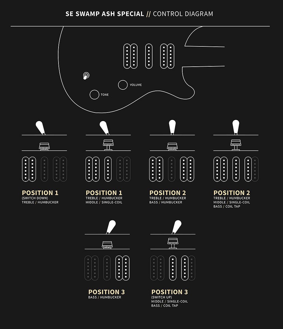 The 85/15 “S” pickups flank a PRS-Designed AS-01 Single Coil “S” pickup in the middle position. The AS-01 Single Coil features both alnico and steel (hence the name), which adds mass to the pickups helping to create a powerful sound. Paired with a push-pull tone control and 3-way pickup switch, this pickup/electronics package gives players an array of sounds to enjoy, and the addition of PRS’s patented tremolo adds a touch more versatility. The overall tone of the PRS SE Swamp Ash Special offers tight lowend, bright but mellow high-end, and a welcome twangy tone that can reach “hot country,” blues, and even jazz territory.