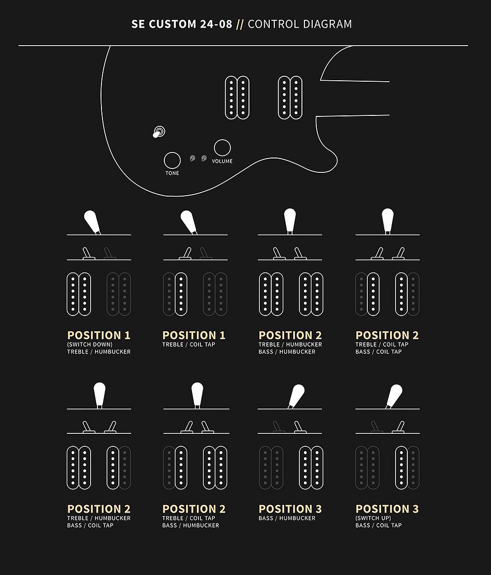 The Custom 24 is the quintessential PRS guitar: the iconic guitar that started it all back in 1985. The Custom 24-08 keeps all the foundational specs of the instrument, while taking the Custom platform to new sonic territories. Like the Core Series instrument, the SE Custom 24-08 features two mini-toggle coil-tap switches that individually tap the humbuckers for single coil sounds and a total of eight pickup configurations.