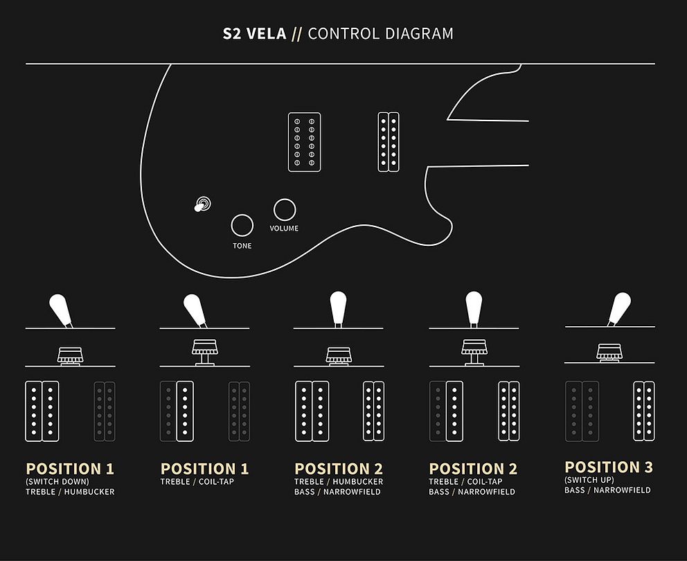 Loaded with a PRS DS-01 humbucker in the treble pickup position and the PRS Narrowfield in the bass pickup position, the Vela has a bright, punchy tone that sounds great plugged into your pedalboard or straight into an amp. A coil-tap on the tone control allows the DS-01 pickup to split into single coils and explore a whole new range of tones.