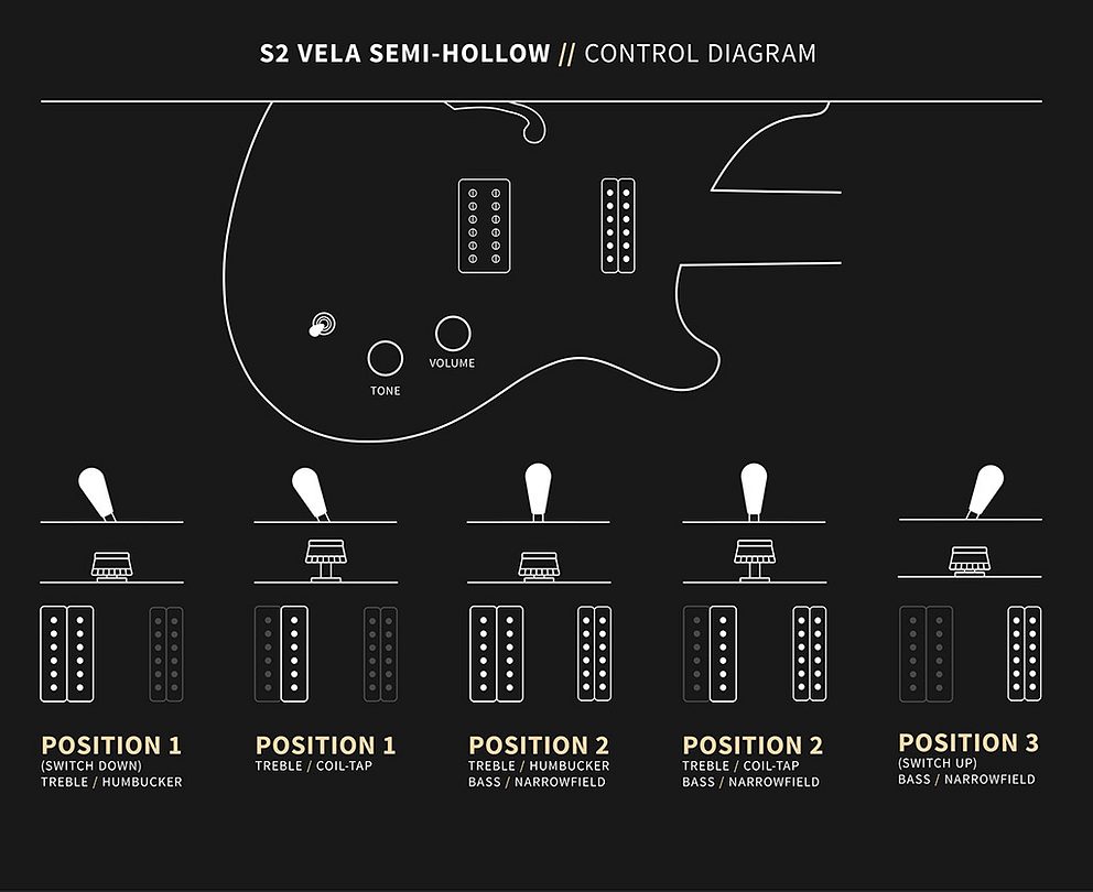 The pickguard-loaded electronics feature a PRS DS-01 pickup in the treble pickup position, providing a bright, chimey tone, and the PRS Narrowfield in the bass pickup position gives the Vela some noteworthy bite. The coil-tap on the tone control allows the treble pickup to split to single coils, providing even more tonal versatility.