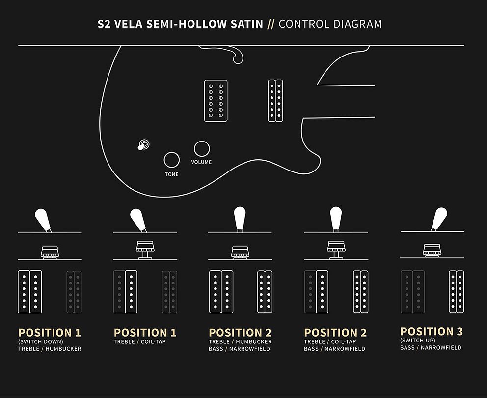 The pickguard-loaded electronics feature a PRS DS-01 pickup in the treble pickup position, providing a bright, punky tone, while the PRS Narrowfield in the bass pickup position gives the Vela some noteworthy bite. The coil-tap on the tone control allows the treble pickup to split to single coils, providing even more tonal versatility.